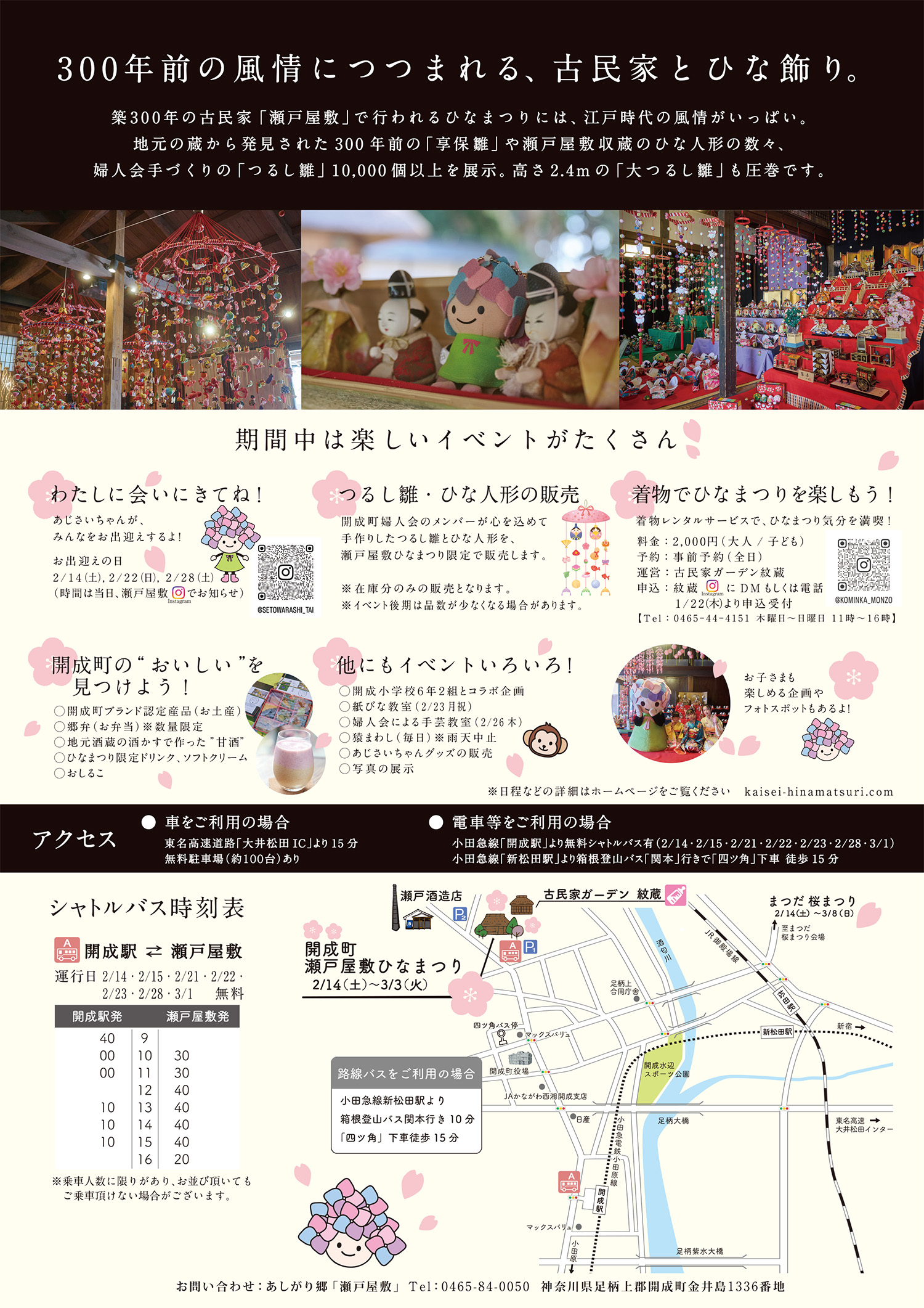 瀬戸屋敷ひなまつりのチラシ2026 が完成しました✨ 投稿公開日:2026年1月20日 投稿カテゴリー:イベント / お知らせ R8年2月14日(土)~3月3日(火)まで開催される、開成町瀬戸屋敷ひなまつりのチラシが完成しました✨開成町内のお店を中心に配布をしていきます! ぜひチェックしてください👍 Instagram Facebook ぜひチェックしてください👍 Instagram Facebook おすすめ 瀬戸屋敷ひなまつりは、令和8年2月14日(土)から3月3日(火)まで開催されます✨ 2025年12月1日 【募集】瀬戸屋敷ひなまつり出店者募集 2025年12月10日